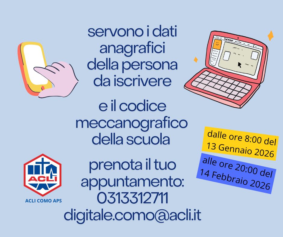 con la presente desideriamo segnalare la disponibilità del nostro sportello di facilitazione digitale “Punto Digitale Facile”, attivo a supporto delle famiglie nella compilazione delle iscrizioni online alle classi prime della scuola primaria e secondaria di primo e secondo grado, tramite la piattaforma UNICA del Ministero dell’Istruzione e del Merito, da oggi fino al 14.02.2026.
