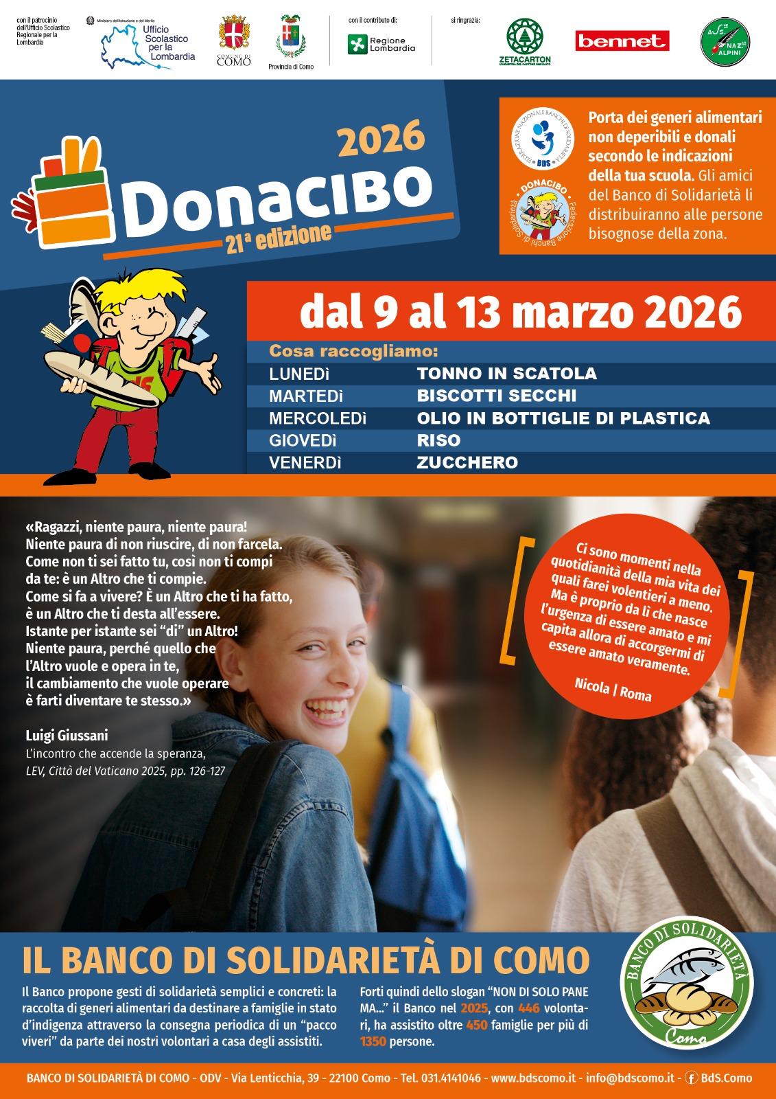 “Donacibo” è un’iniziativa permanente che si svolge ogni anno dal 2007 su tutto il territorio nazionale. Questa iniziativa è rivolta a tutte le scuole di ogni ordine e grado ed è coordinata dalla Federazione Nazionale dei Banchi di Solidarietà.